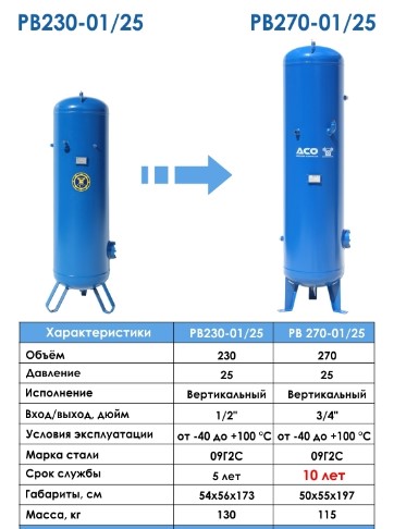 Воздушный ресивер РВ 230-01/25 Бежецкого завода АСО с вертикальным воздухосборником объемом 230 л рассчитан на максимальное рабочее давление 25 атм и работу при температуре от - 40 до + 100 °C,