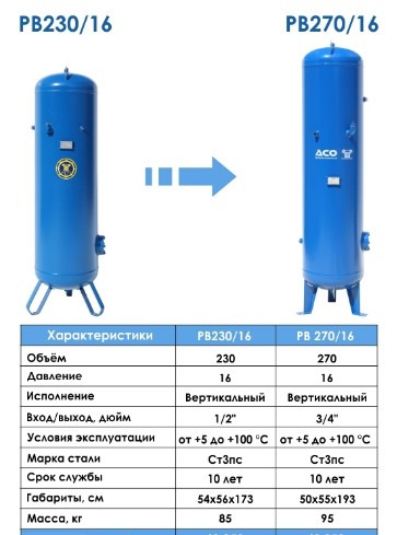 Вертикальный воздушный ресивер РВ 230/16 Бежецкого завода АСО имеет объем 230 л и рассчитан на эксплуатацию при рабочем давлении до 16 атм и температуре от + 5 до + 100 °C,
