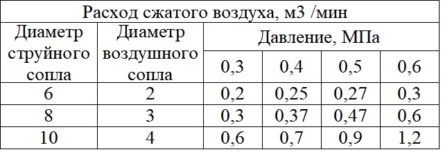 Сопло воздушное используется в пескоструйных пистолетах эжекторного типа NowAG вместе со струйным соплом. Расход сжатого воздуха, в зависимости от диаметра, указан в таблице.
