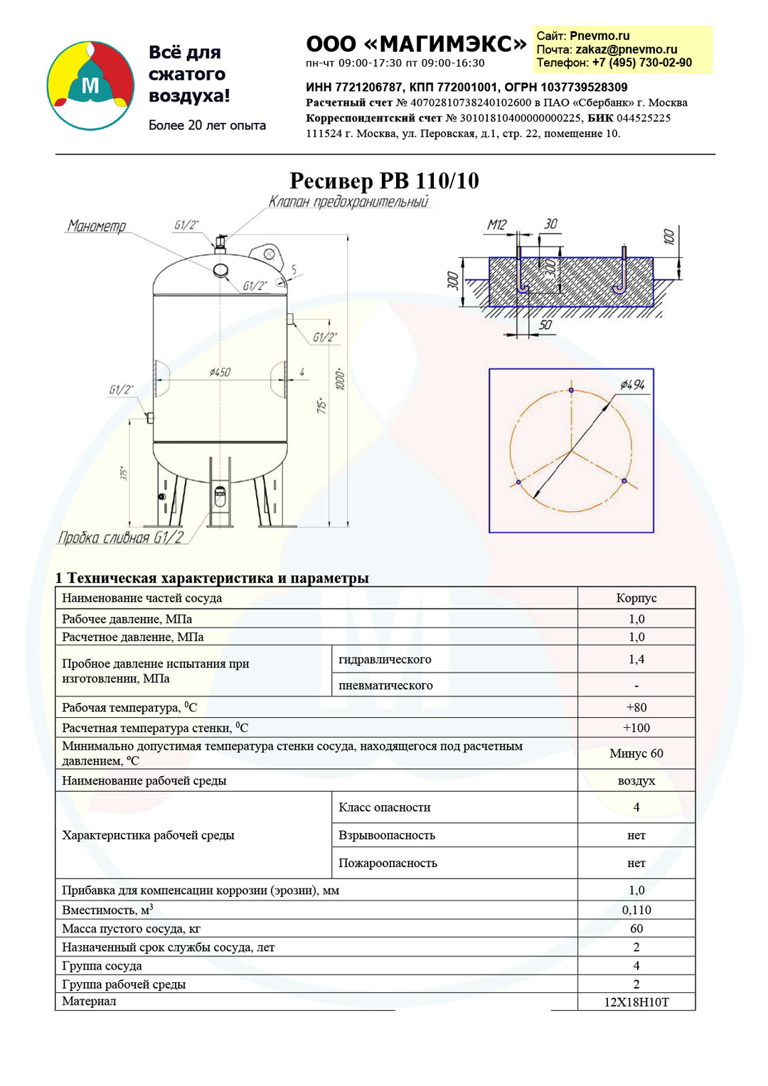 Ресивер вертикальный воздушный РВ 110-02/10 с объемом 110 л рассчитан на максимальное рабочее давление 10 атм и температуру эксплуатации от - 60 до + 100 °C,