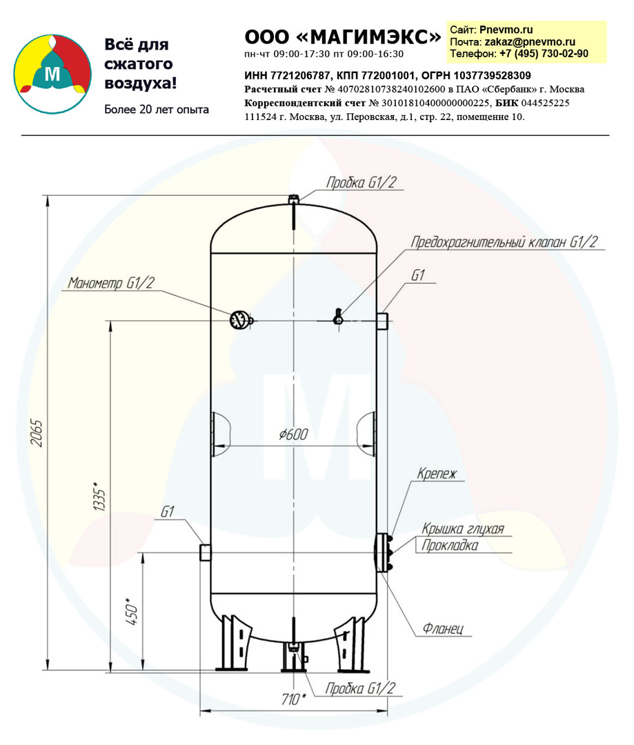 Ресивер воздушный РВ 500-02/10 объемом 500 л рассчитан на рабочее давление 10 атм и температуру эксплуатации от - 60 до + 100 °C,
