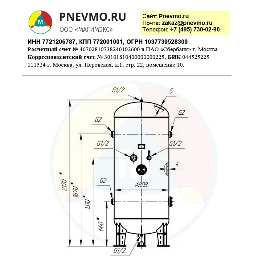 Ресивер воздушный РВ 900-02/10 имеет объем 900 л и рассчитан на максимальное рабочее давление 10 атм при температуре эксплуатации от - 60 до + 100 °C.