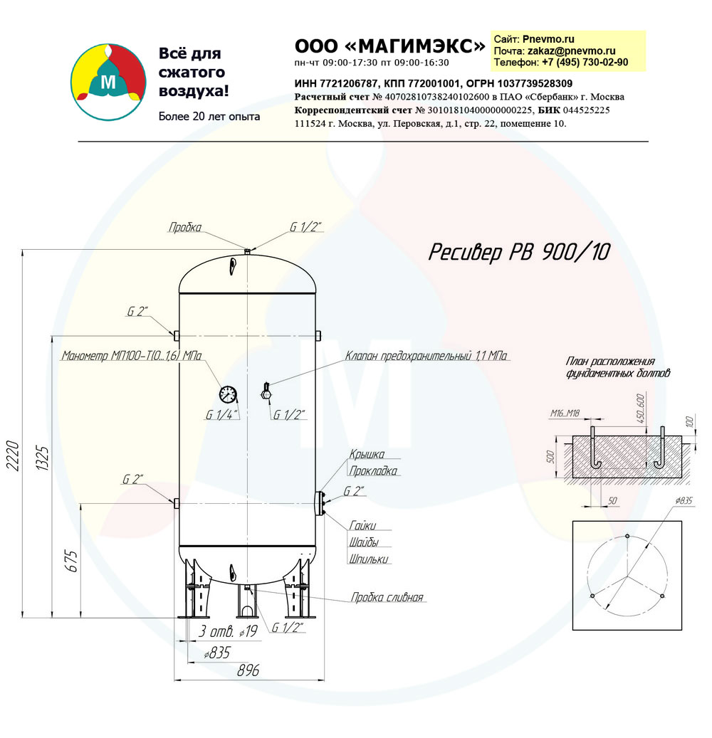 Ресивер воздушный оцинкованный РВ 900/10Ц Бежецкого завода АСО объемом 900 л рассчитан на рабочее давление 10 атм и температуру эксплуатации от - 20 до + 100 °C,